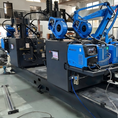 Stack the hanging pieces in order on the automatic hanging piece feeding platform,then input the signal,the machine starts to automatically load the hanging pieces,and at the same time,the robot automatically grabs the crossbeam to the specified position of the machine platform,starts welding,first welds the two sides,rotates 90 degrees and then welds the two sides to complete the welding,rotates to another station,and the robot takes the material to the finished product stacking,and the robot takes the material again,and the above actions are repeated. All the above actions are controlled and operated by the dedicated system for the crossbeam automatic line