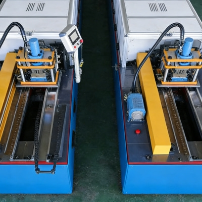 The machine features wear-resistant roller sets made from imported Japanese SUJ2 alloy steel. After vacuum quenching and precision grinding, the roller surface hardness reaches HRC64, ensuring stable forming when processing 1.0–3.2 mm hot-dip galvanized steel, cold-rolled steel, and Q355 high-strength steel. Its modular quick-change structure enables mold replacement within 20 minutes, supporting shelving components with widths from 300mm to 1000mm and heights up to 5000mm.