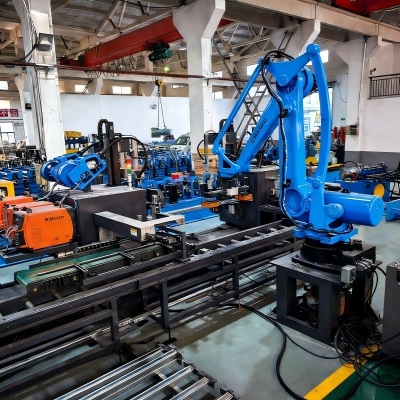 Stack the hanging pieces in order on the automatic hanging piece feeding platform,then input the signal,the machine starts to automatically load the hanging pieces,and at the same time,the robot automatically grabs the crossbeam to the specified position of the machine platform,starts welding,first welds the two sides,rotates 90 degrees and then welds the two sides to complete the welding,rotates to another station,and the robot takes the material to the finished product stacking,and the robot takes the material again,and the above actions are repeated. All the above actions are controlled and operated by the dedicated system for the crossbeam automatic line