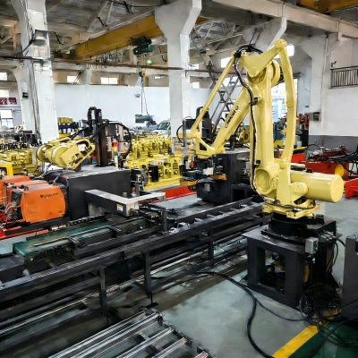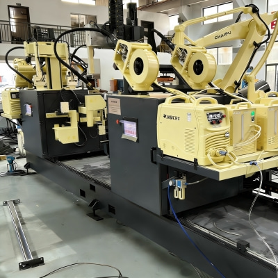 Stack the hanging pieces in order on the automatic hanging piece feeding platform,then input the signal,the machine starts to automatically load the hanging pieces,and at the same time,the robot automatically grabs the crossbeam to the specified position of the machine platform,starts welding,first welds the two sides,rotates 90 degrees and then welds the two sides to complete the welding,rotates to another station,and the robot takes the material to the finished product stacking,and the robot takes the material again,and the above actions are repeated. All the above actions are controlled and operated by the dedicated system for the crossbeam automatic line