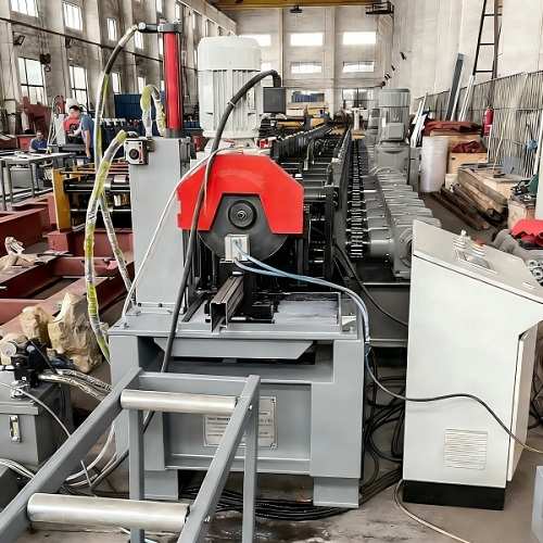The roll forming process involves passing a flat strip of metal through a series of rollers that progressively bend and shape the metal into the desired beam profile. The rollers have specific contours and designs that form the metal strip into the desired shape. The process is continuous, and the machine can produce beams of various lengths.